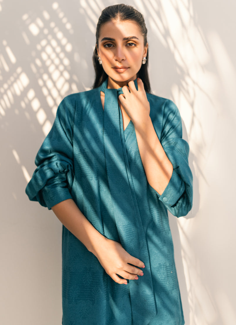 This dark teal textured co-ord set allows for the shirt to fall gracefully in a flowing silhouette, pairing well with the loose-fitting pants in warm dobby viscose material to keep you cozy during the winter season. The stylish cuffed sleeves add a touch of flair to the simple v-neck shirt.
